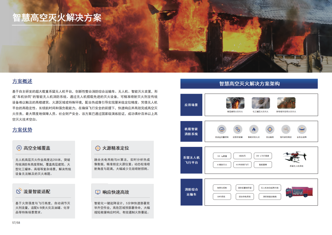 “一体两翼”业务模块,无人智能装备系统+飞思实验室。核心产品包括单机无人装备、集群无人系统,无人机仿真平台等,应用涵盖国防、教育科研、应急消防、水利林草、电力、石油与天然气等领域。
