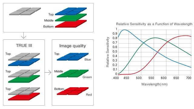 借助经典的拜耳彩色滤镜,Foveon总能让传感器占用更少的三维空间。从官方原理图来看,RGB 的每一层,都由四个像素块构成。在创建了通道亮度之后,可以将颜色数据组合到一起,以形成全彩色的图片。