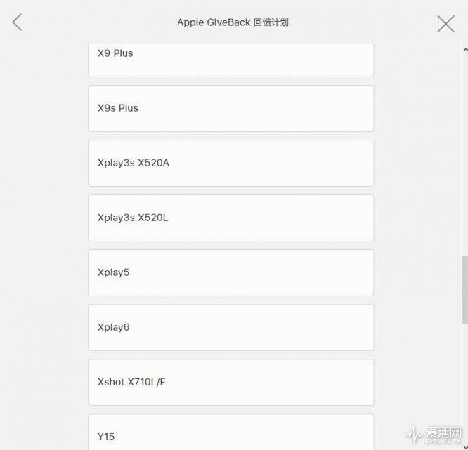 vivo—— 苹果给出的vivo手机型号列表跨度从V3起,到X9s Plus/Xplay6止,往后的新机不接受折价换购,统统回收处理。通过换购vivo手机,你将能获得最高650元RMB的iPhone新机购买折扣(选择128GB Xplay6)。