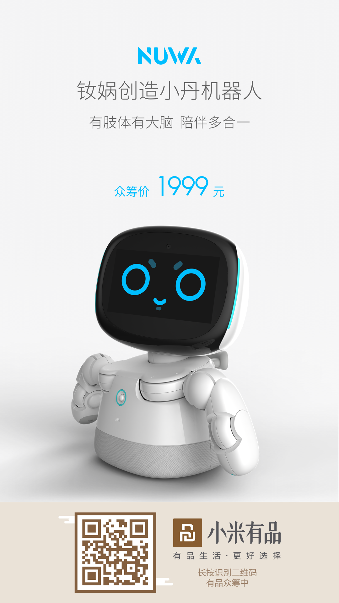 6月12日10:00,小米生态链公司钕娲创造小丹智能机器人,在小米“精品生活电商平台——有品”首发众筹,众筹价1999元。该款产品采用多项核心技术,钕娲创造自主研发的伺服舵机,让小丹机器人拥有灵活的肢体,从而具备丰富的表现力;人工智能,使小丹拥有高智商和贴近人类直觉的沟通方式。