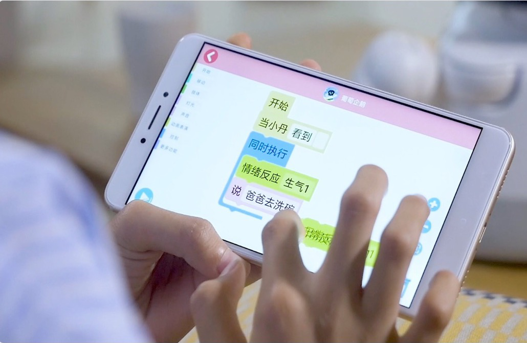 另外,儿童编程也是小丹的一大特色。使用者只需要花极短的时间,就可以自行编出用传统程序需要花很长时间编写的内容。比如编一个可以让小丹看到妈妈就称赞妈妈好漂亮,但看到爸爸就会生气地命令爸爸去洗碗的指令,只需要拖拉几行程序即可达成。