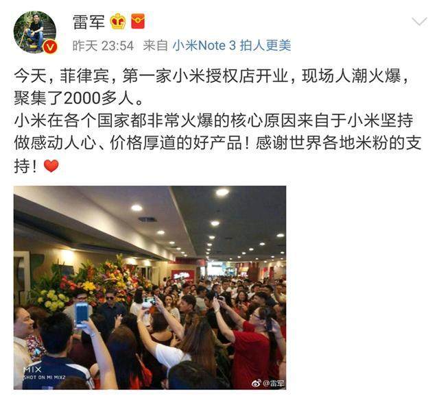2月19日,小米授权店首次进驻菲律宾首都马尼拉的市中心,吸引了超过2000人到场,场面十分火爆。小米的创始人兼首席执行官雷军发微博称,“小米在各个国家都非常火爆的核心原因来自于小米坚持做感动人心、价格厚道的好产品!”